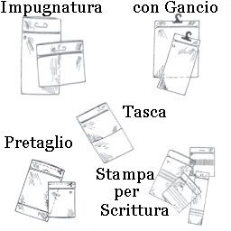 Possiamo fustellare una impugnatura o un euroforo e per appendere applichiamo un gancio. Per uso medico la busta con la tasca è prodotta in numerose varianti e puo' dividere le fiale, le protesi o altro dalle schede.